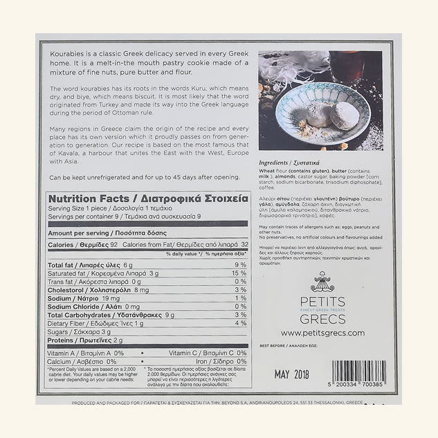 Ingrediente: faina de grau (contine gluten), unt (contine lapte), migdale, zahar pudra, praf de copt (amidon de porumb, bicarbonat de sodiu, trisodium diphosphate), cafea.