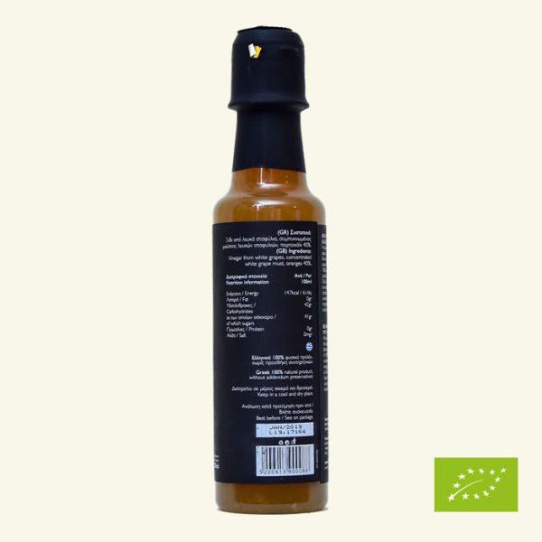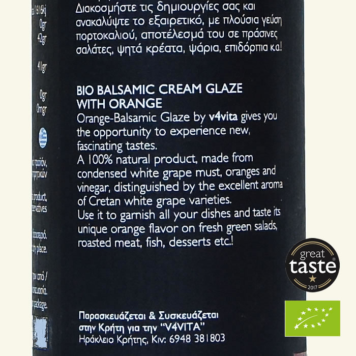Crema balsamica cu portocale BIO este un produs 100% natural, rezultat din prelucrarea mustului de struguri albi, portocale de cea mai buna calitate si otet. Produsul este o evocare a aromelor excelente de soiuri cretane de struguri albi, fiind totodata realizat dupa retete traditionale grecesti. Recoltarea portocalelor are loc atunci cand fructele ating gradul potrivit de maturitate si nu trec prin procese termice care ar putea denatura elementele nutritive.
