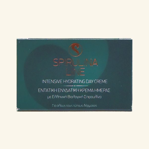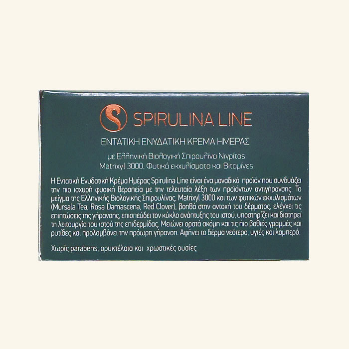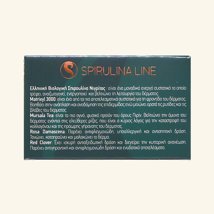 Crema de zi intens hidratanta pentru fata cu spirulina organica Nigrita, Matrixyl 3000, extracte din plante, vitamine cu ingrediente active: spirulina organica greceasca Nigrita, Matrixyl 3000, sideritis scardica, trandafir bulgaresc, trifoi rosu.