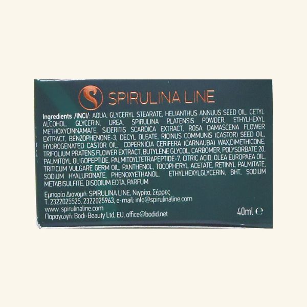 Ingrediente/INCI/: apa, stearat gliceril, ulei de floarea soarelui, alcool cetilic, glicerina, uree, pudra de spirulina, ethylhexyl methoxycinnamate, extract din sideritis scardica, extract de trandafir bulgaresc, benzophenone-3, decyl oleate, ulei din seminte de ricin, ulei de ricin hidrogenat, ceara de Carnauba, dimethicone, extract de flori de trifoi, butylene glycol, carbomer, polysorbate 20, palmitoyl oligopeptide, palmitoyltetrapeptide-7, acid citric, ulei de masline, ulei din germeni de grau, panthenol, tocopheryl acetate, retinyl palmitate, sodium hyaluronate, phenoxyethanol, ethylhexylglycerin, bht, metabisulfit de sodiu, disodium edta, parfum.