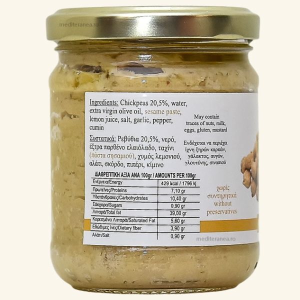 Ingrediente: naut 20.5%, apa, ulei de masline extravirgin, pasta de SUSAN, suc de lamaie, sare, usturoi, piper, chimion.