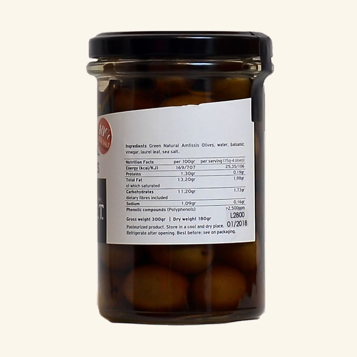 Ingrediente: masline verzi naturale Amfissis, apa, otet balsamic, frunze de dafin, sare de mare. 100% masline naturale, preparate dupa o reteta traditionala, utilizand doar sare de mare si apa. Produs pasteurizat. Nu contine conservanti. Cu 40% mai putina sare. Total compuși fenolici (antioxidanți): 2696 ppm.