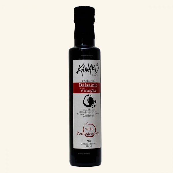 Oțetul balsamic cu rodii Kanakis este un produs natural, obținut din struguri cultivați în regiunea Peloponez și rodii coapte din Grecia. Creat după o rețetă tradițională, acest oțet combină dulceața subtilă a rodiei cu aciditatea echilibrată a oțetului balsamic, oferind un gust complex și rafinat, ideal pentru preparate mediteraneene.