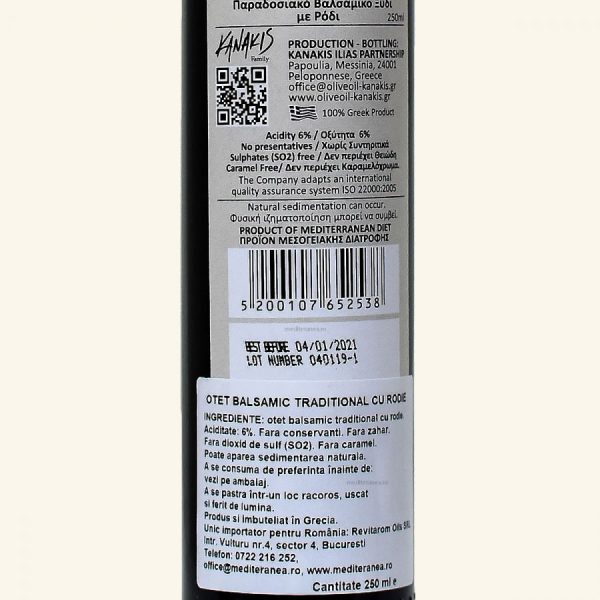 Produsul reflectă tradiția gastronomică grecească, fiind realizat în loturi mici, cu atenție la fiecare etapă a procesului. Este potrivit pentru un stil de viață echilibrat și pentru cei care caută alternative naturale în bucătărie. Fie că îl folosești zilnic sau în rețete speciale, oțetul balsamic cu rodii adaugă profunzime și savoare fiecărui preparat.