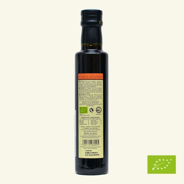 Doua produse traditionale obtinute din struguri apartinand varietatii “Agiorgitiko”, anume otetul din vin rosu si siropul natural de struguri, “petimezi”, sunt imbinate intr-o reteta unica, rezultatul fiind un otet dulce, rafinat. Nu e nevoie decat de o singura picatura pentru a simti aroma deosebita a strugurilor “Agiorgitiko” si gustul dulce al “petimezi”, contopite in mod incantator cu aciditatea caracteristica a otetului.