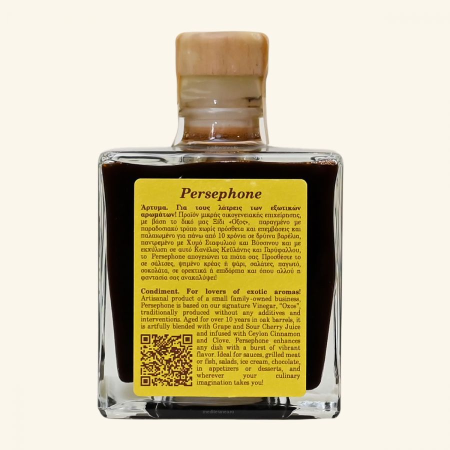 Produs artisanal al unei mici afaceri de familie, Persephone are la baza otetul “Oxos” produs in mod traditional fara aditivi sau interventii. Invechit timp de peste 10 ani in butoaie de stejar, este infuzat cu scortisoara Ceylon si cuisoare. Persephone imbunatateste orice fel de mancare, cu o explozie de aroma vibranta. Ideal pentru sosuri, carne sau peste la gratar, salate, inghetata, ciocolata, in aperitive sau deserturi si oriunde va poarta imaginatia culinara. Ca alternativa, poate fi servit ca digestiv, cu gheata zdrobita.