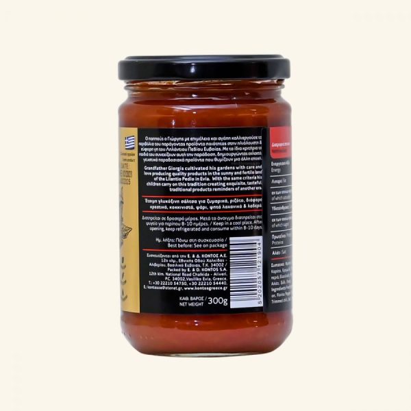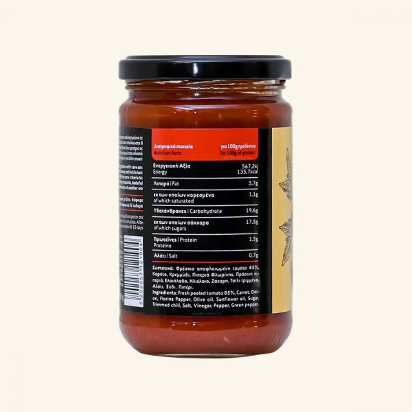 INGREDIENTE: rosii proaspete decojite 85%, morcovi, ceapa, ardei Florina, ulei de masline, ulei de floarea-soarelui, zahar, chili taiat, sare, OTET, piper, ardei verde.